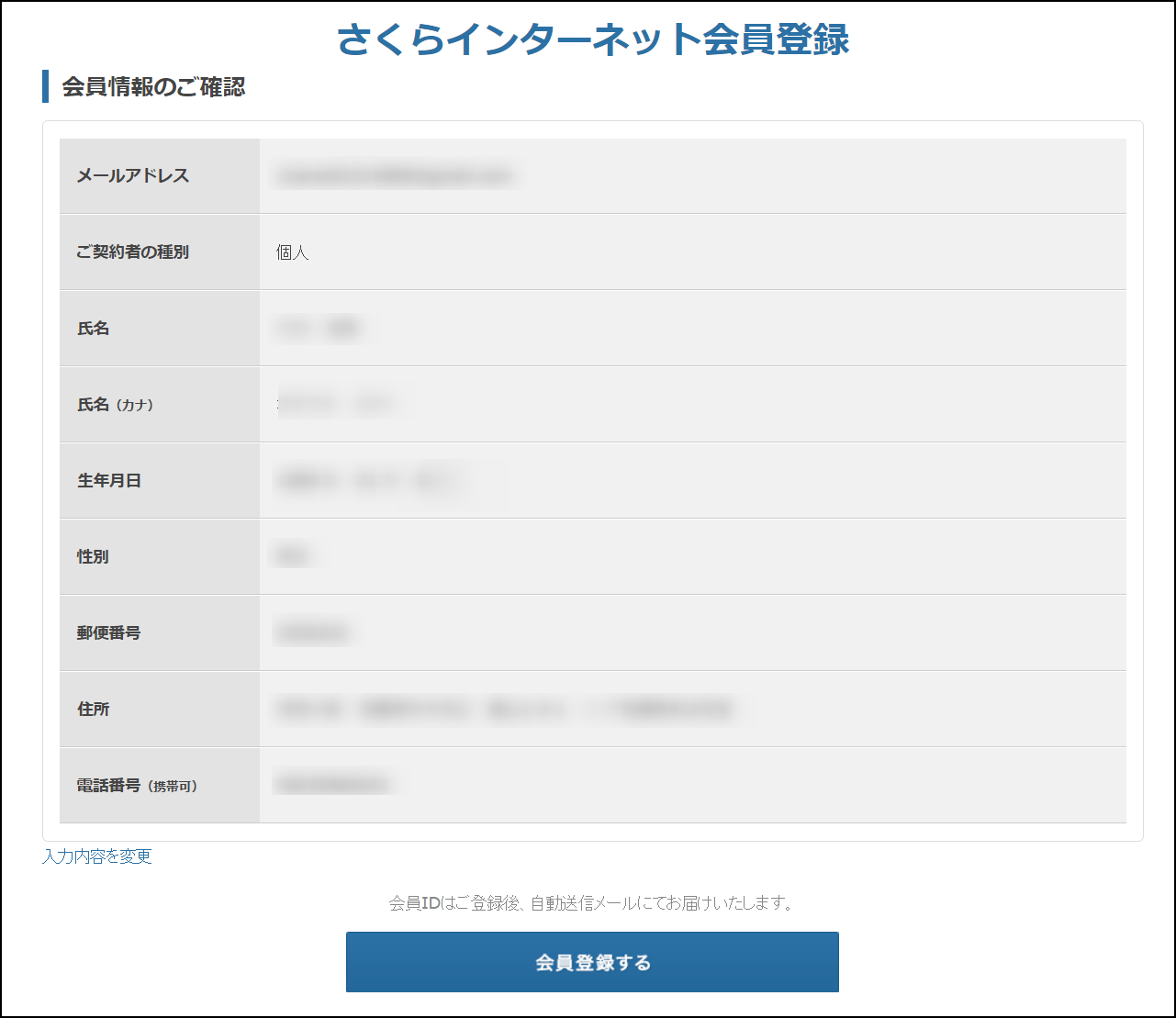 確認画面に進んだから、入力内容に間違いがないことをよく確認して問題なければ『会員登録する』をクリックしよう。入力ミスなどがあれば『入力内容を変更』をクリックして修正してから会員登録を進めていこう。