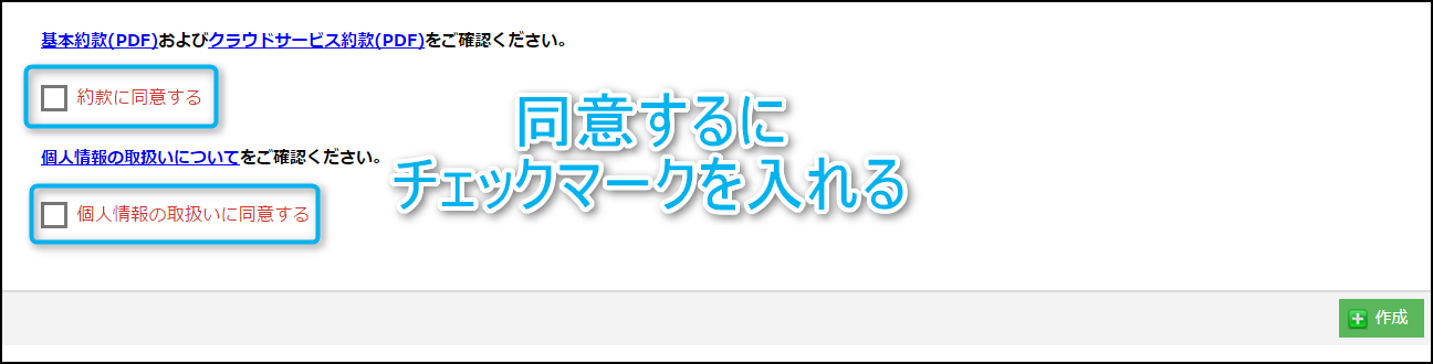 アカウントの作成画面を開いたら『約款(やっかん)に同意する』と『個人情報の取扱いに同意する』の2つにチェックマークを入れよう。もちろん、約款と個人情報の取扱いについてのページはしっかり目を通してね。