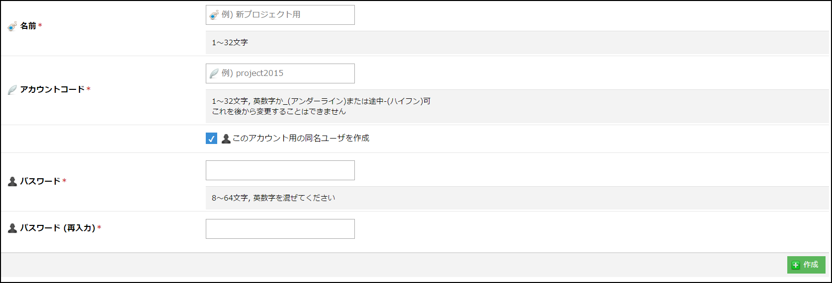 チェックマークを入れると下に新しい項目が表示される。ここは『名前』と『パスワード』を入力して『作成』をクリックして欲しい。