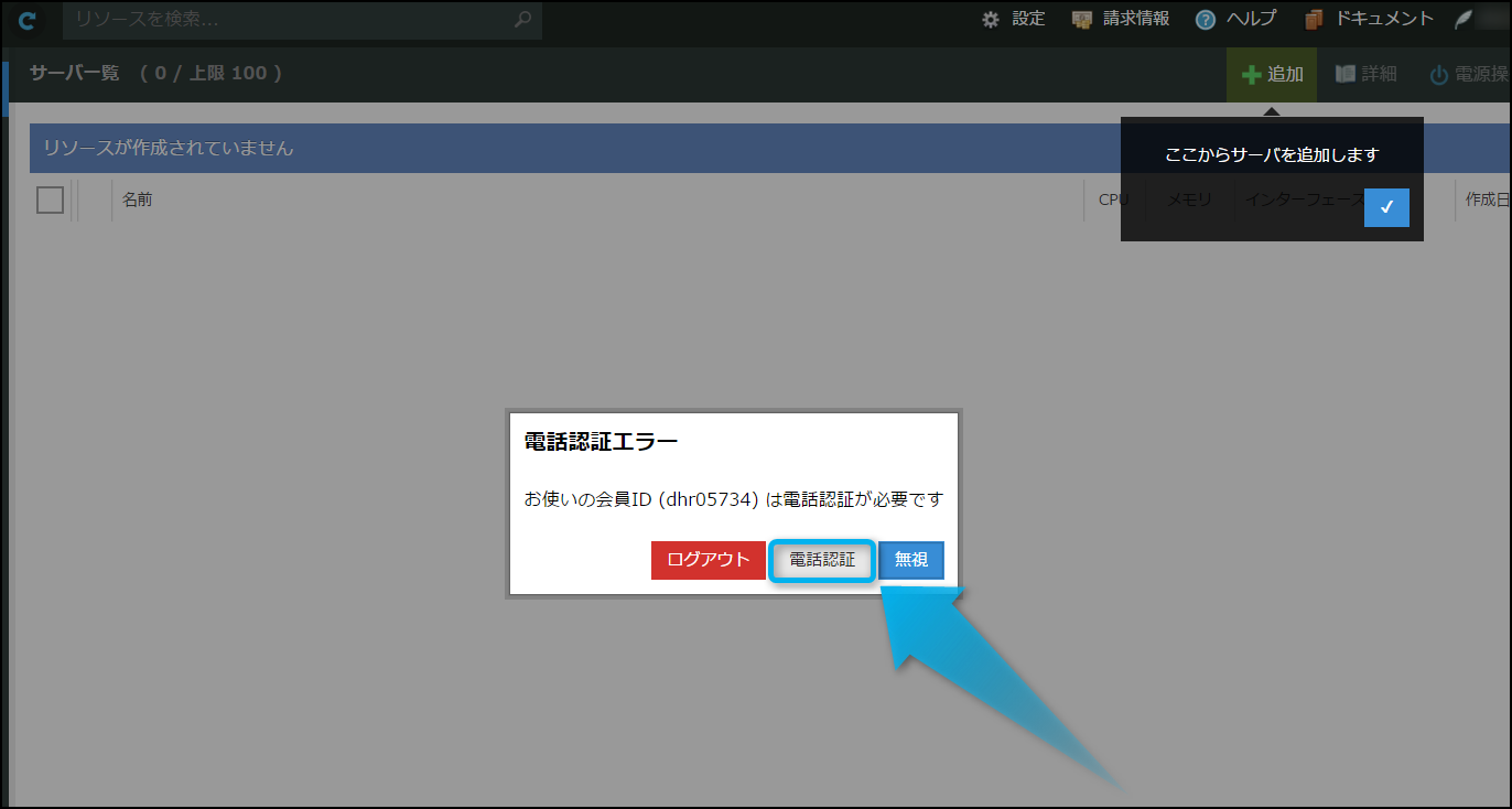 さくらクラウド(IaaS)の画面を開くと、電話認証エラーの画面が表示されるから『電話認証』を選択しよう。