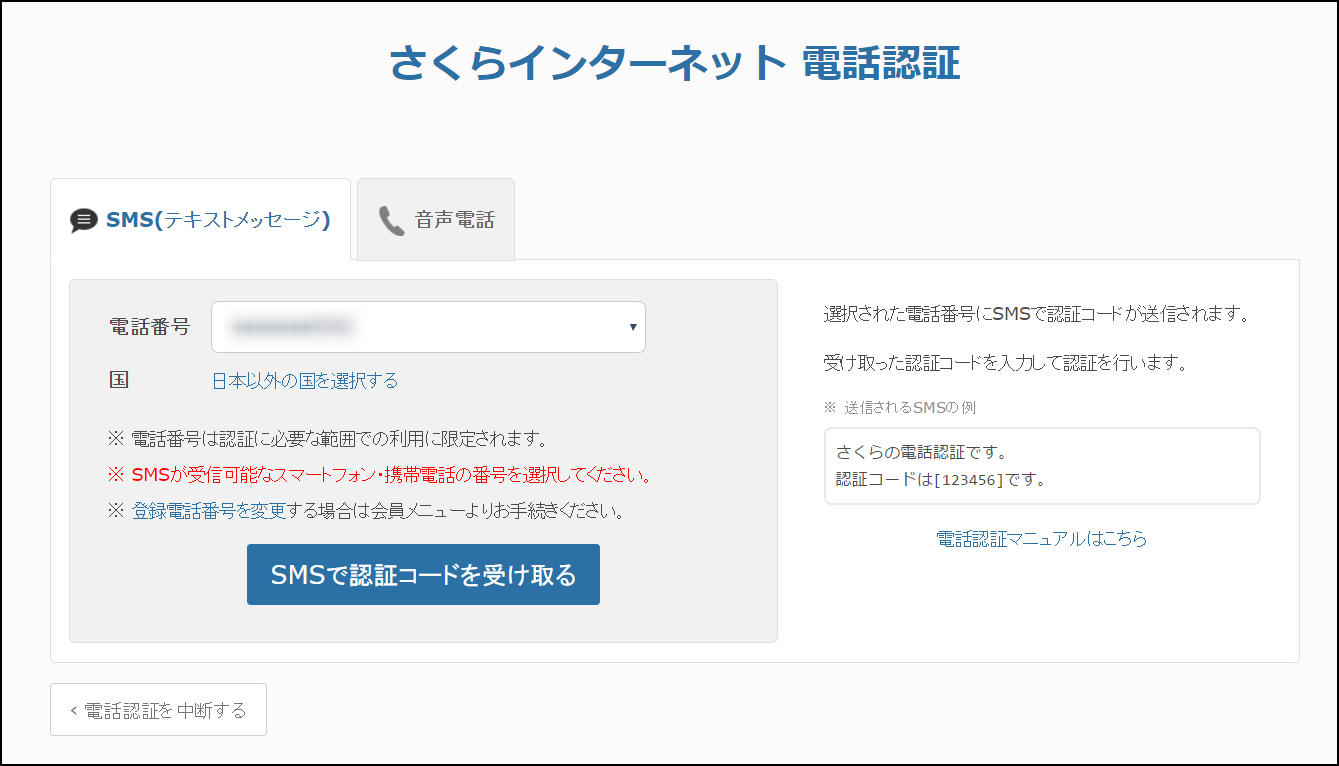 電話認証はSMS(テキストメッセージ)と音声電話と2つの方法から好きな方を選択することが出来るよ。今回は『SMS(テキストメッセージ)』を利用するから『SMS認証コードを受け取る』をクリックしよう。