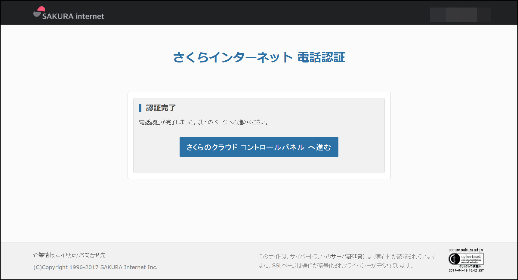 認証完了のメッセージが表示されたら『さくらのクラウド コントロールパネルへ進む』をクリックして欲しい。