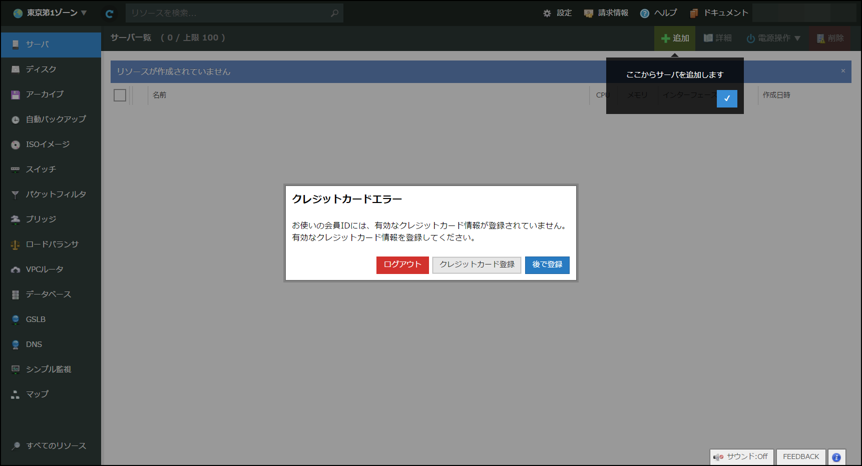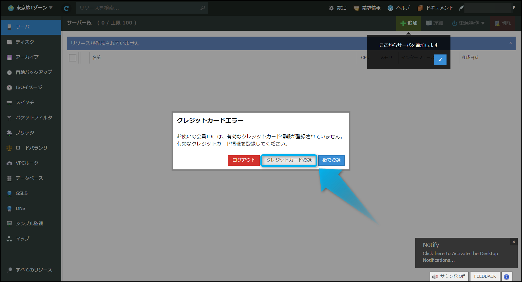 コントロールパネルに戻ってくると、次はクレジットカードエラーの画面が表示される。サーバーを作成するには当然お金がかかる。お金を支払うにはクレジットカード登録が必要になるから、ここは『クレジットカード登録』を選択しよう。