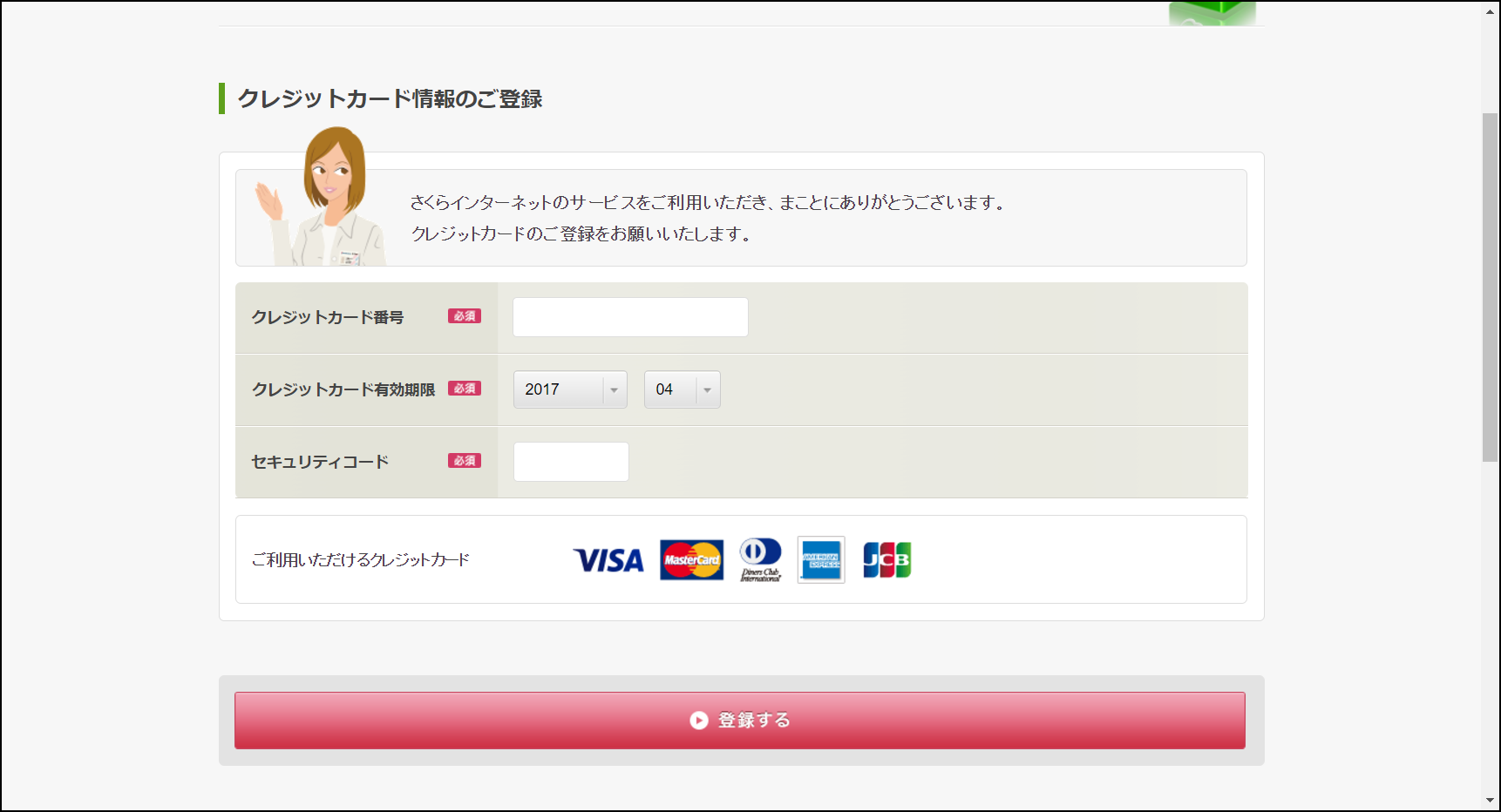 ログインが完了したら、クレジットカード番号、クレジットカード有効期限、セキュリティコードを全て入力していこう。入力が終わったら『登録する』をクリックしてね。