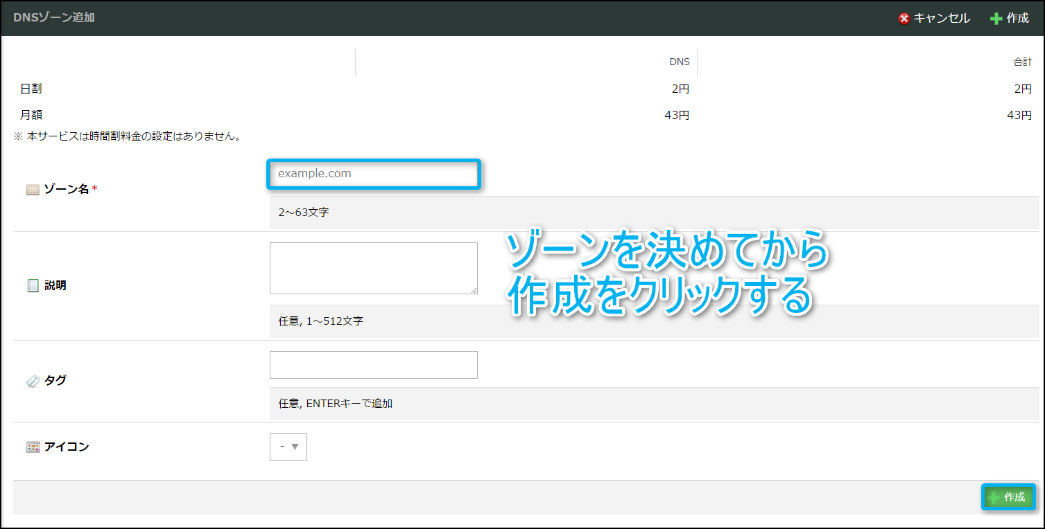 DNSゾーン追加の画面を開いたら『ゾーン名』だけ入力して『作成』をクリックして欲しい。ゾーンはドメインだね。事前にムームードメインなどで取得しておく必要があるよ。