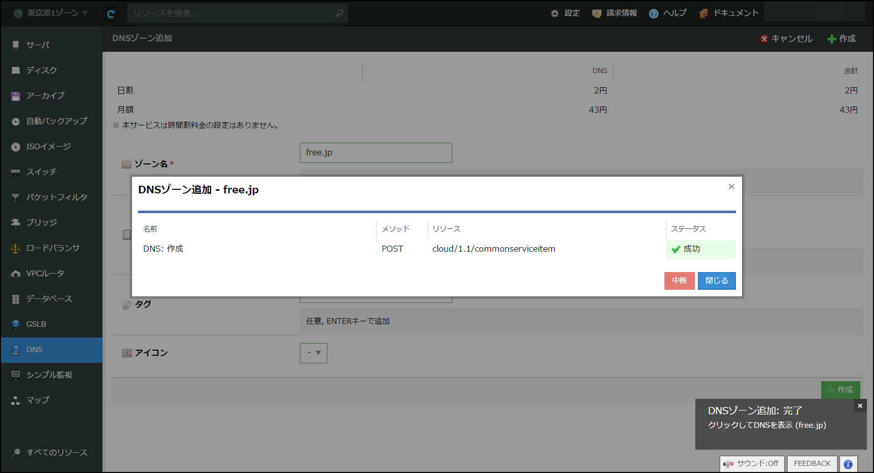 DNSゾーン追加の画面が表示されて、ステータスが『成功』になったら『閉じる』をクリックしよう。これでDNSゾーンの追加作業は終わり。