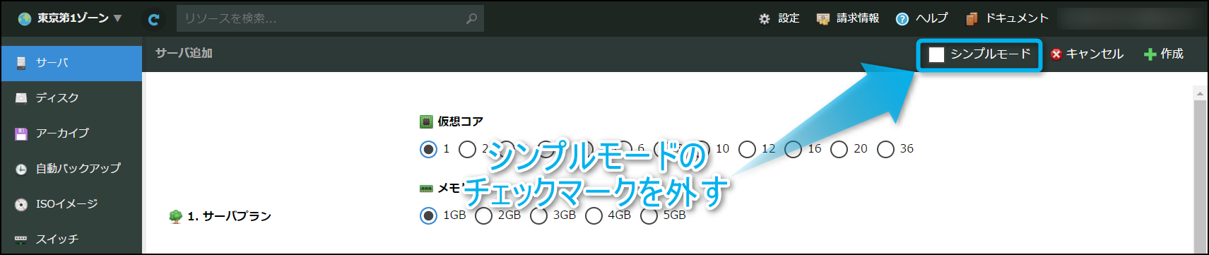 追加の画面を開いたら、画面右上にある『シンプルモード』をクリックしてチェックマークを外して欲しい。