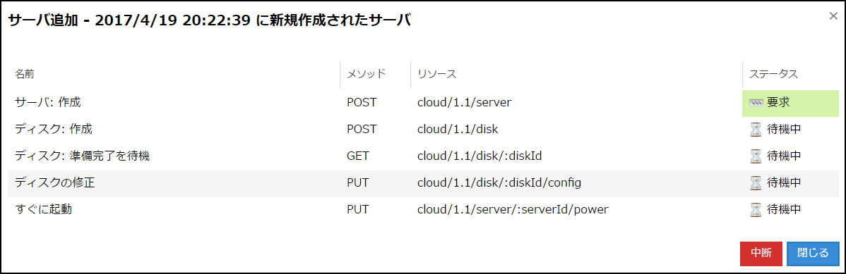 サーバ:作成、ディスク:作成、ディスク準備完了を待機、ディスクの修正、すぐに起動の全てが成功になったら『閉じる』をクリックしよう。