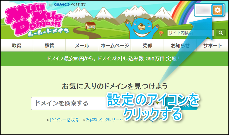 まずは、トップページ右上にある『設定のアイコン』をクリックしよう。