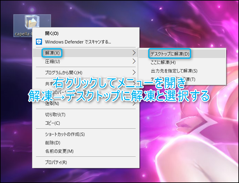解凍方法はファイルを選択後、右クリックしてメニューを開き『解凍』→『デスクトップ』と選択する。(今回は分かりやすいように解凍先をデスクトップに指定。)