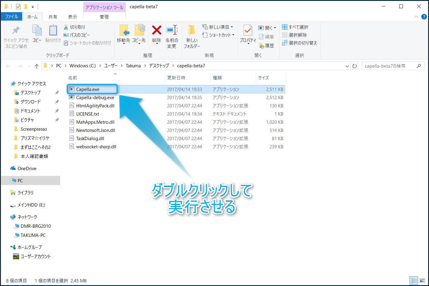 解凍が終わったら『capella-beta7のフォルダー』を開き『Capella.exe』をダブルクリックして実行させよう。
