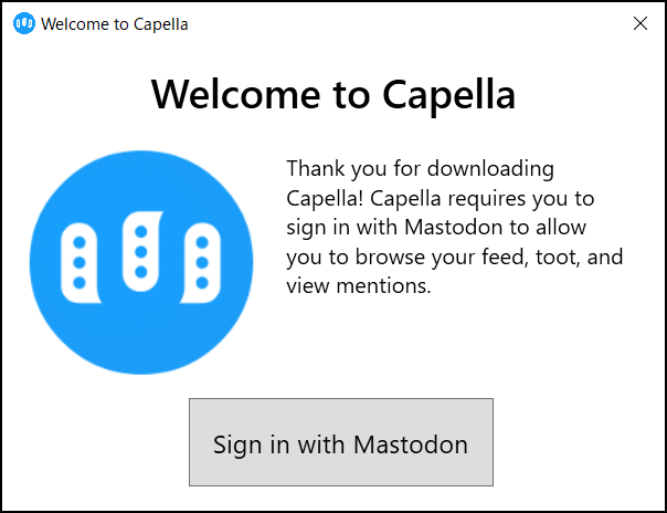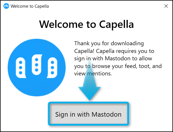 Welcome to Capellaの画面を開いたら『Sign in with Mastodon』をクリックして欲しい。