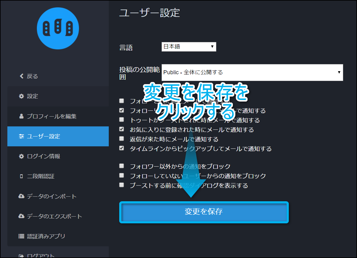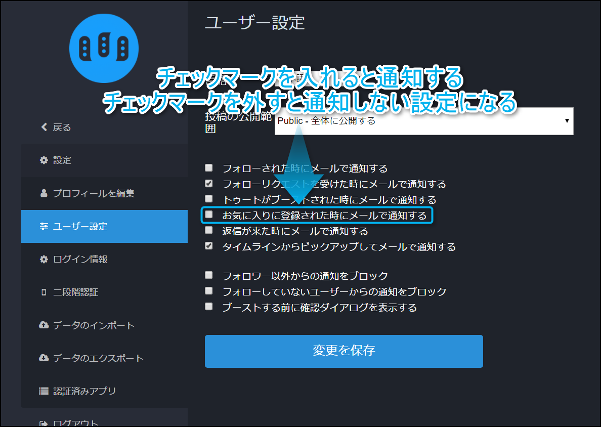ユーザー設定の画面を開いたら『お気に入りに登録された時にメールで通知する』をクリックしてチェックマークを付けてみよう。これで自分のトゥートに対して誰かがお気に入り登録してくれた時にメールで通知されるようになったよ。