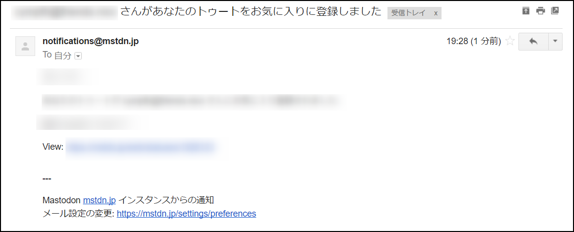 メールで通知する設定にした状態でお気に入り登録されると、上の画像のように誰からどのトゥートに対してお気に入り登録されたのかメールで教えてくれるよ。