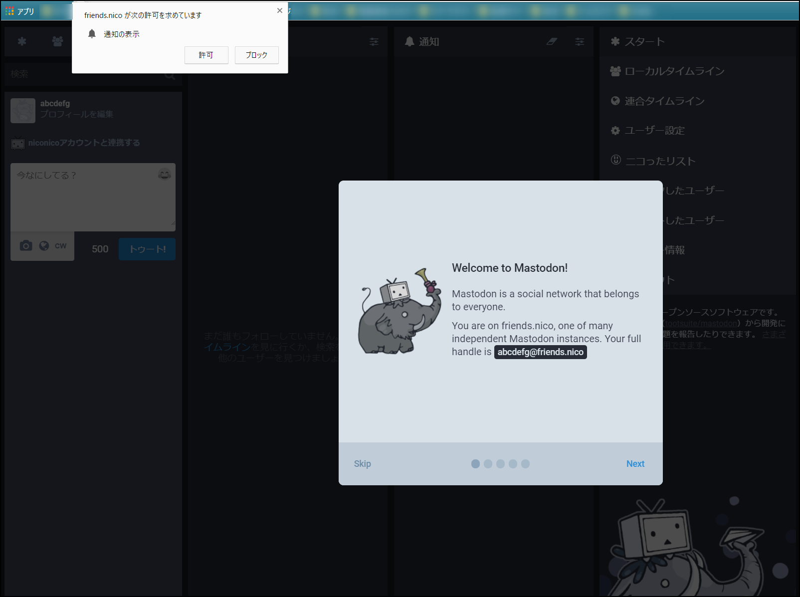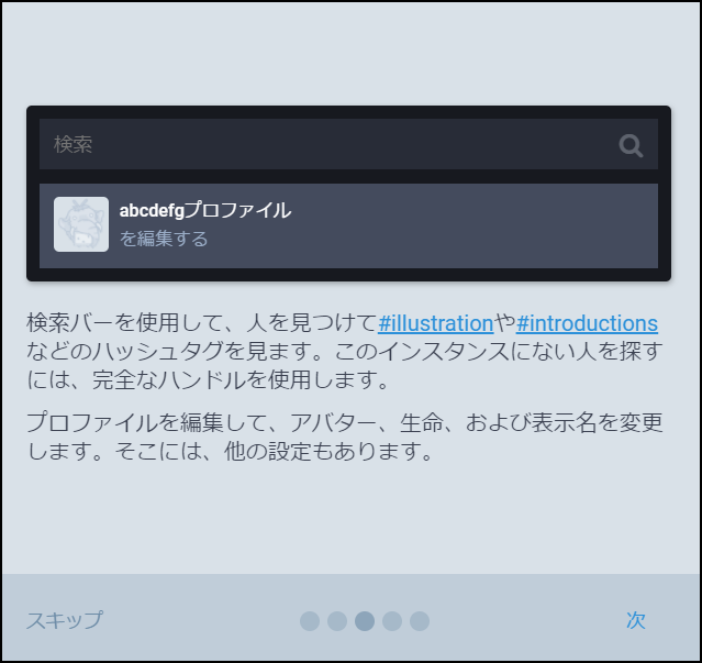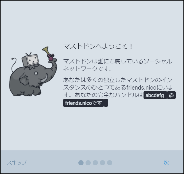最初は『マストドンへようこそ!』の画面。自分が今どのインスタンスにいるのか教えてくれる。それからユーザー名も表示してくれてるね。確認したら『次へ』をクリックしよう。
