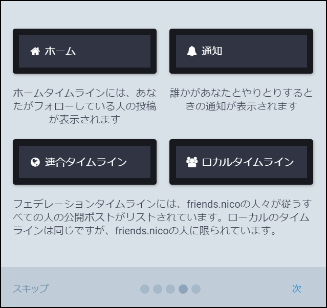 ホーム、通知、連合タイムライン、ローカルタイムラインの説明だね。確認したら『次へ』をクリックしよう。