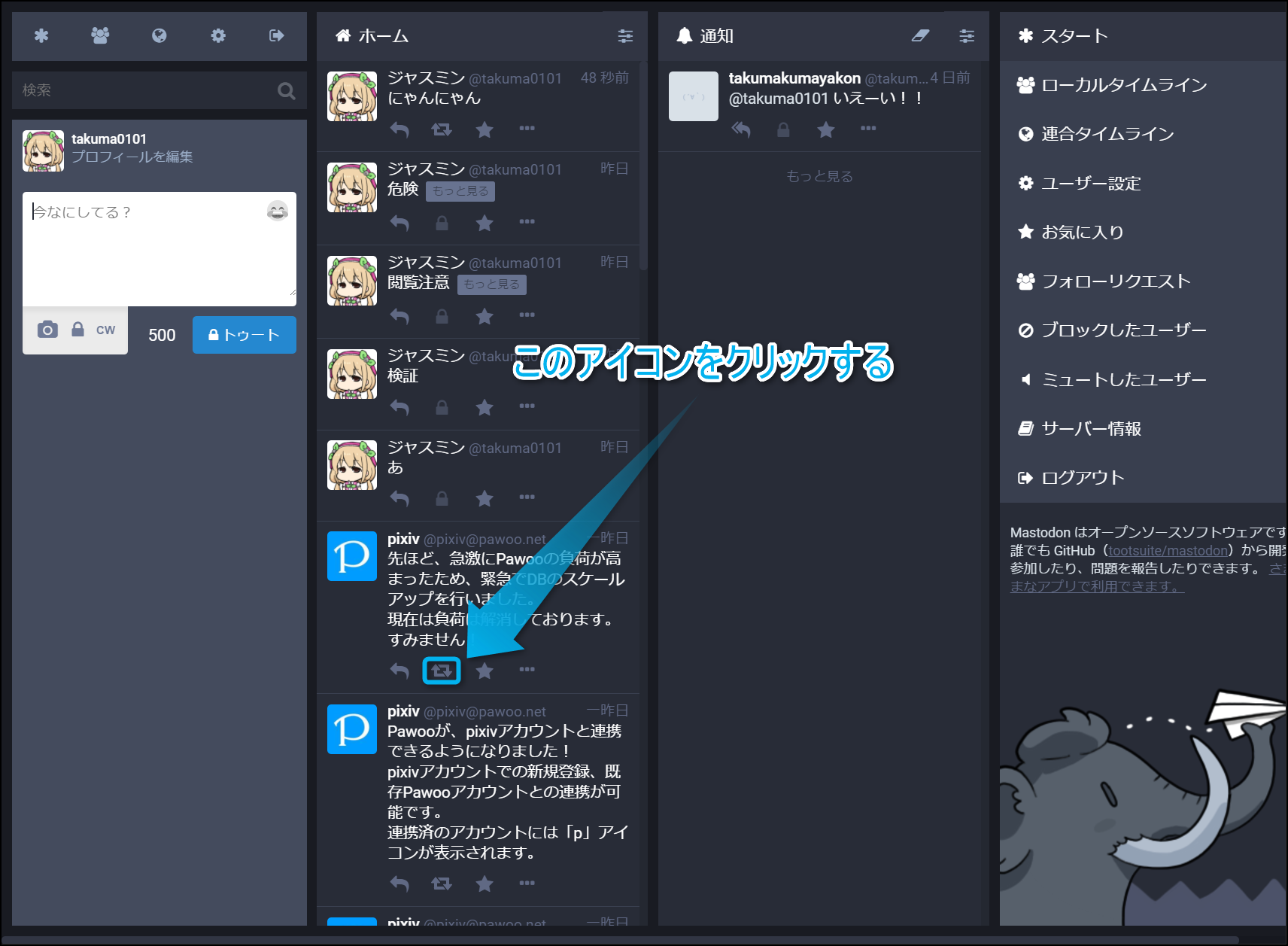 ログインが終わりホーム画面にアクセスしたら、ブーストしたいトゥートを選んで欲しい。今回はpixivのトゥートをブーストしてみるね。