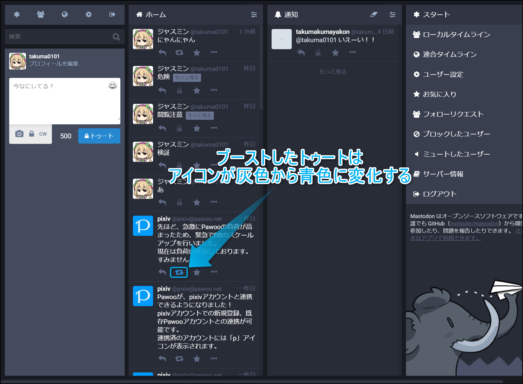 - ブースト:Twitterで言うところのリツイート。簡単に言うと他人のトゥートを拡散する機能。