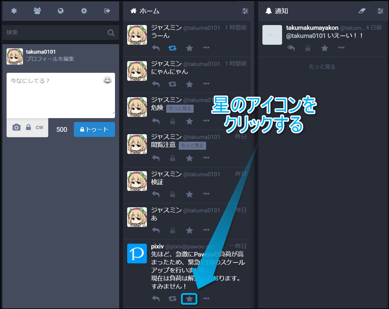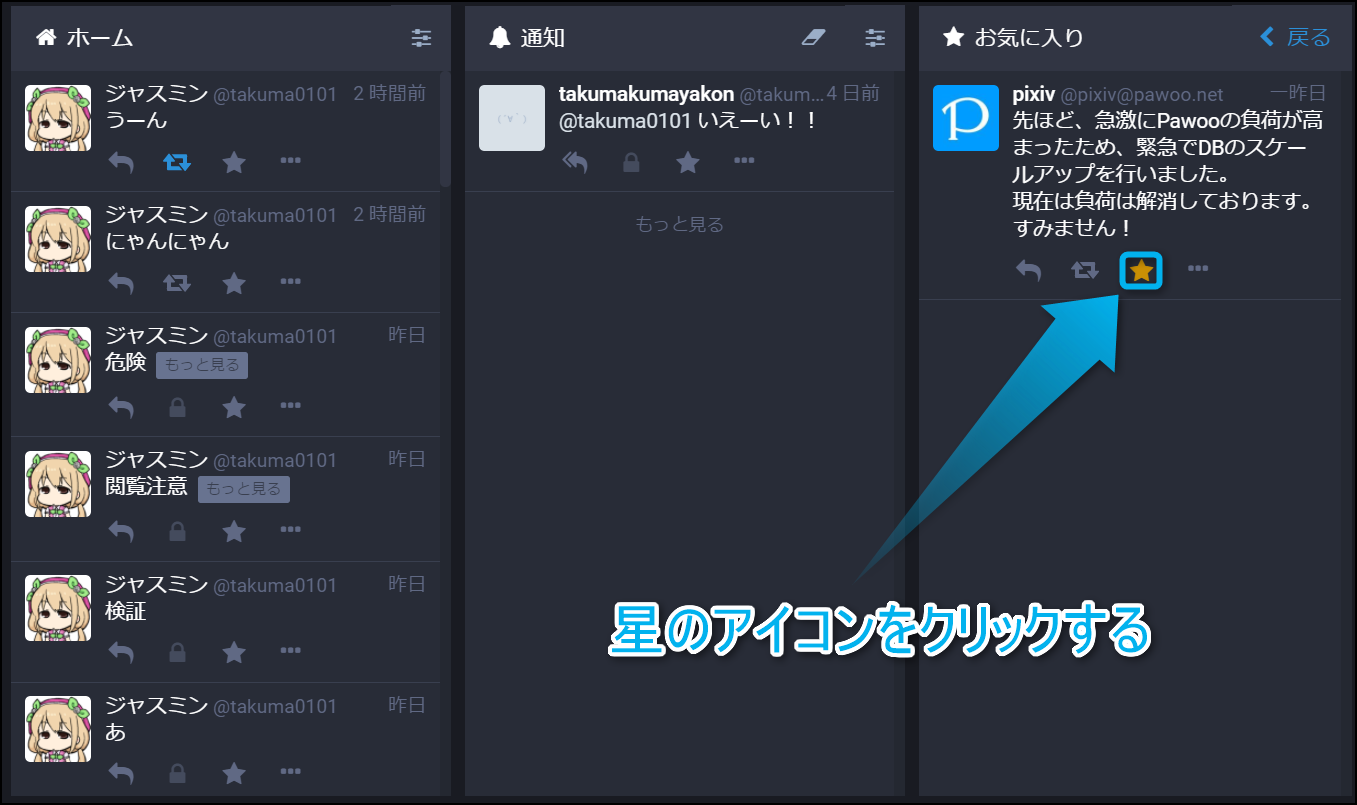 今回はpixivのトゥートをお気に入り登録してみるね。登録したいな。と思ったら『星のアイコン』をクリックしてみよう。