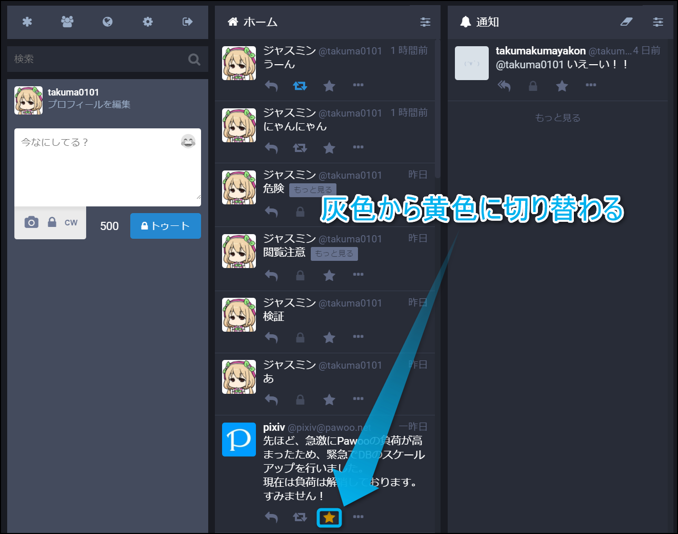 すると、星の色が灰色から黄色に変化する。星の色が黄色のトゥートは既に自分がお気に入り登録をしたものになるからね。