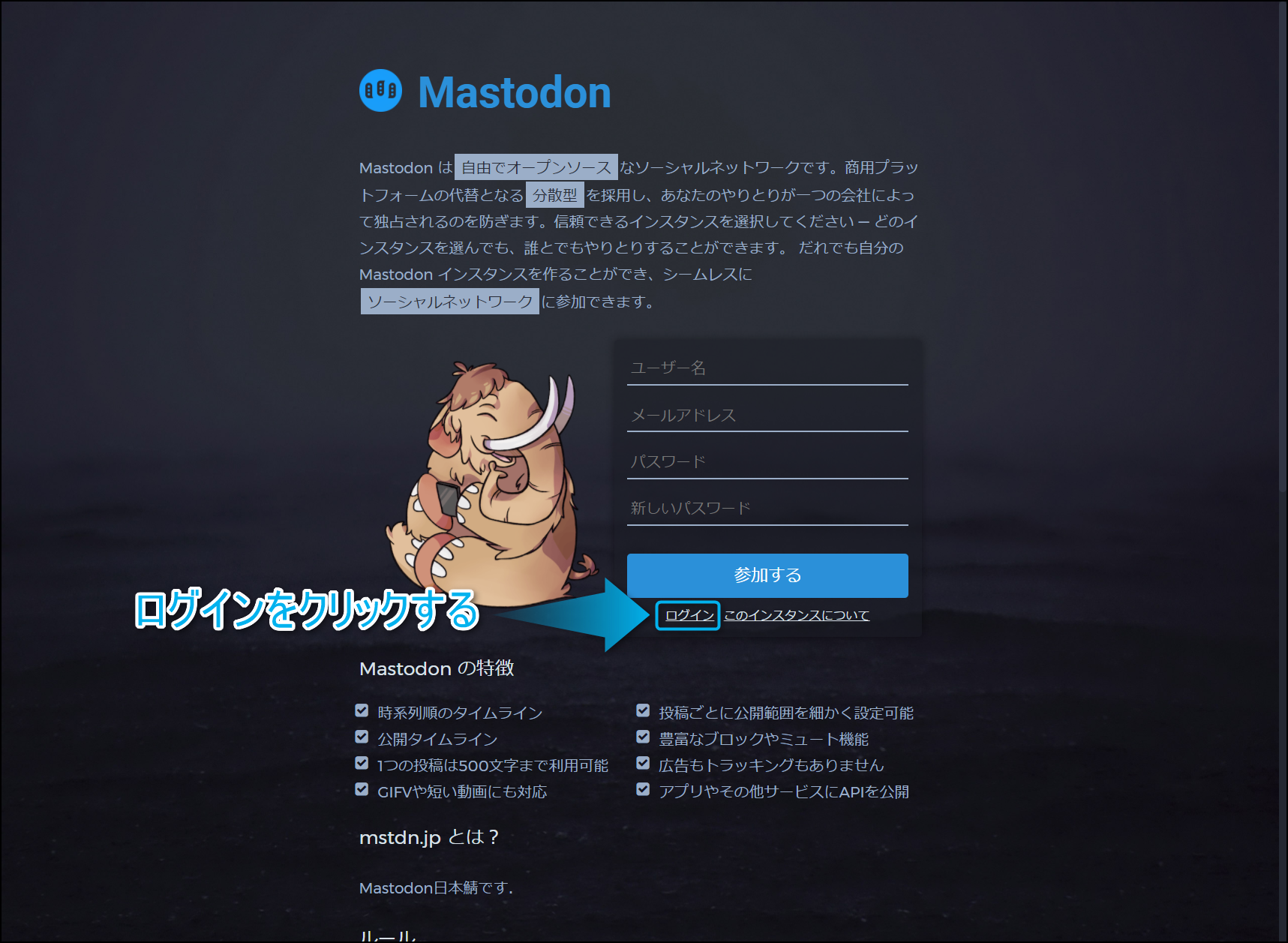 今回は『mstdn.jp(日本のサーバー)』にアクセスするね。アクセスしたら、参加するの真下にある『ログイン』をクリックしよう。