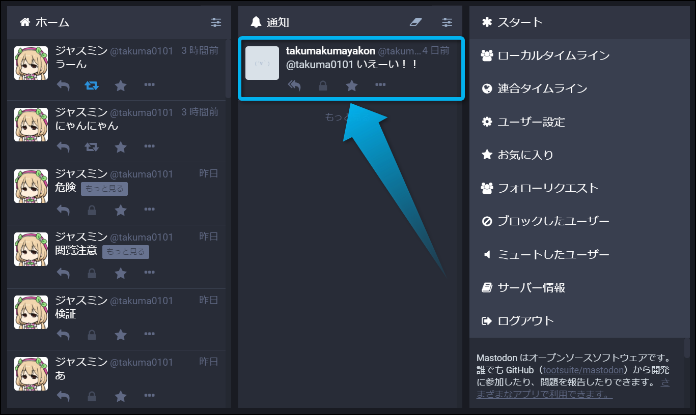 ログインが完了したら、ホーム、通知、ローカルタイムライン、連合タイムラインなどから返信したいトゥートを選んでみよう。