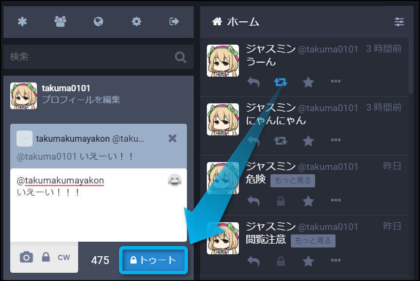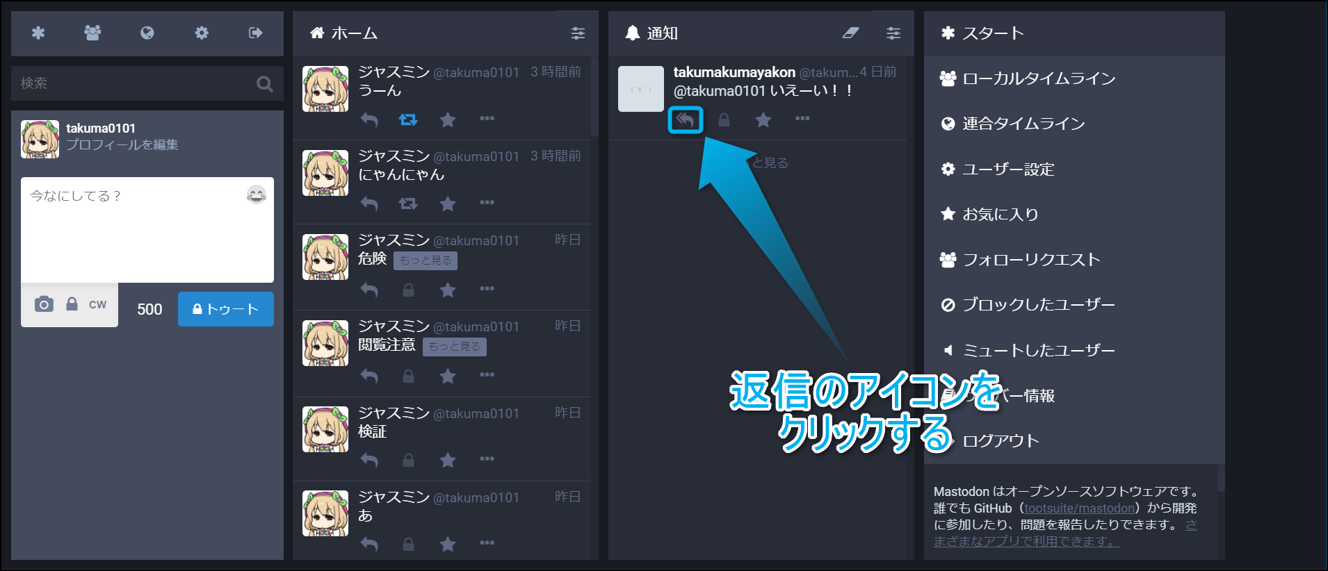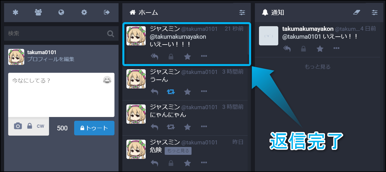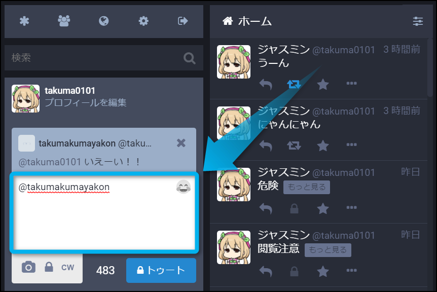 すると、画面左側にあるトゥートの画面に返信のテンプレートが反映されるから、何か返したい言葉を入力しよう。