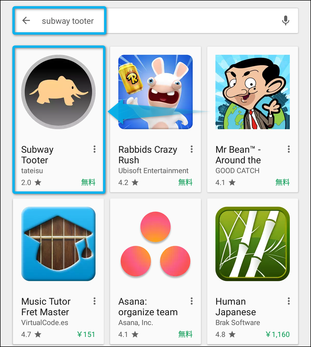 Androidのスマホやタブレットを使って『Playストア』のアプリを起動させて『Subway Tooter』と入力して検索してみよう。