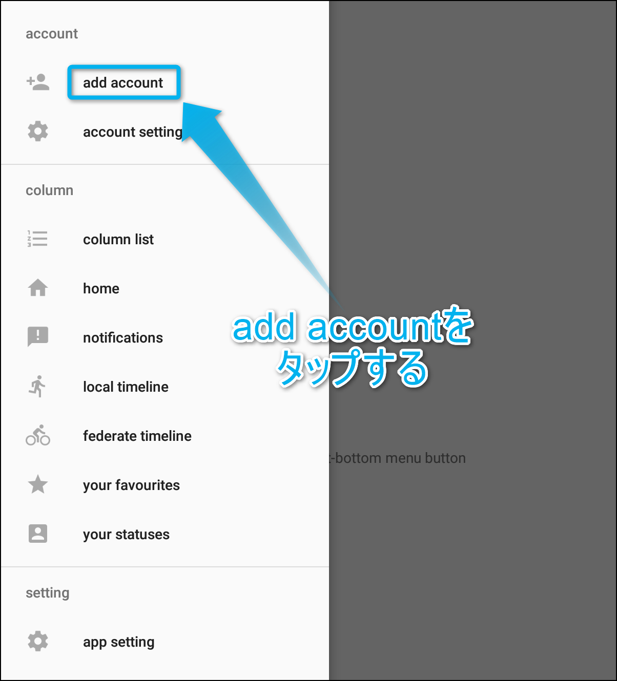 タップすると、左側からメニューが出現するから『add acount』を選択しよう。