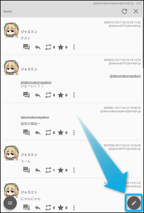 ログインが完了したら早速トゥートをしてみよう。トゥートをするには画面右下にある『ペンのアイコン』をタップして欲しい。
