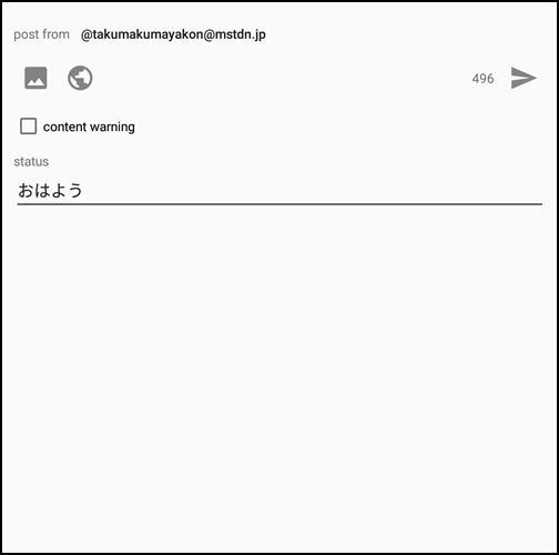 入力が終わったら、右上にある『▶』のアイコンをタップする。これでトゥートが完了するんだけど、心なしかトゥートの反映が遅いような気もする。