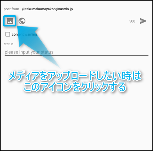 ちなみにトゥートの画面では、公式と同じようにメディアをアップロードしたり・・・