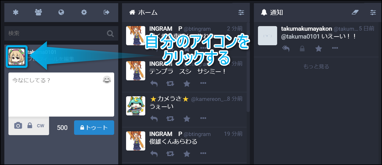 ログインが完了したら、画面左側にある『自分のアイコン』をクリックしよう。