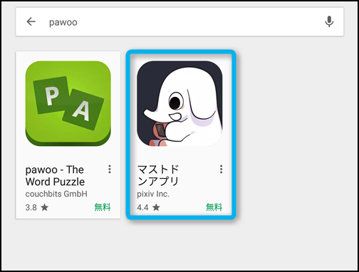検索すると、pawoo - The Word Puzzleとマストドンの2つが引っかかるから、後者の『マストドン』をタップして選択して欲しい。