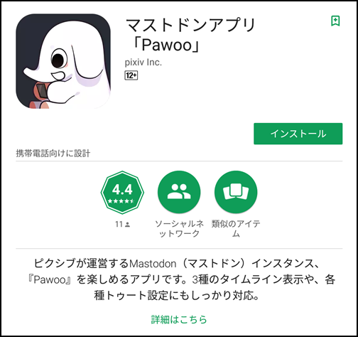 マストドンアプリ「Pawoo」のインストール画面に進んだら『インストール』をタップしよう。容量が大きくないためインストールは数秒程度で完了すると思う。もちろん通信制限などに引っかかっていたらもっと遅くなっちゃうけどね。