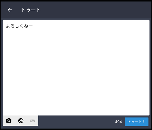 タップするとトゥートの画面に移動出来るから、ここにトゥートしたい内容を入力し『トゥート!』をタップしてみよう。