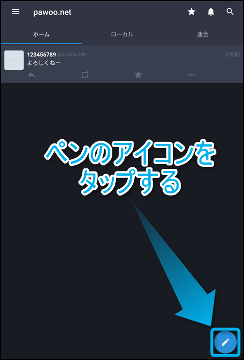 トゥートをしたい場合は、画面右下にある『ペンのアイコン』をタップして欲しい。
