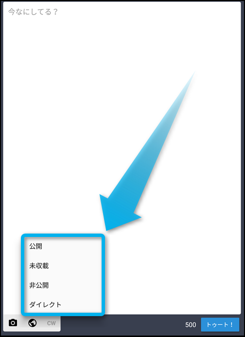 投稿のプライバシー(公開、未収載、ダイレクト)を変更したり・・・CW(テキストを隠す)の機能を使うことも出来るよ。(NSFWにも対応。)