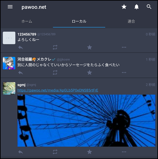 ローカルをタップするとローカルタイムラインの画面開くことが出来る。
