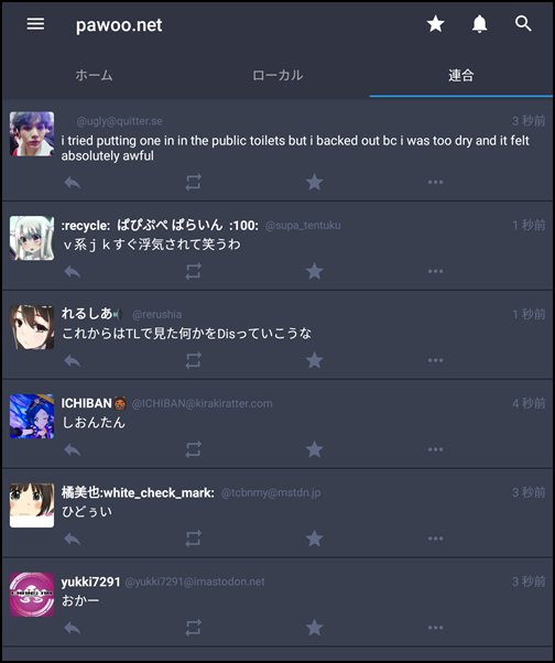 全てのインスタンスのトゥートがここに表示される。ローカルタイムラインでも物足りない!というあなにぴったり。いや、ローカルタイムラインで事足りるだろ。と思うけど。