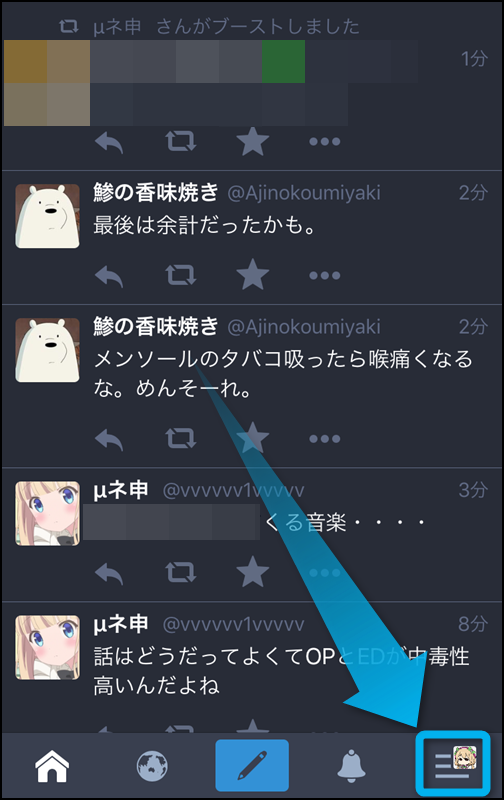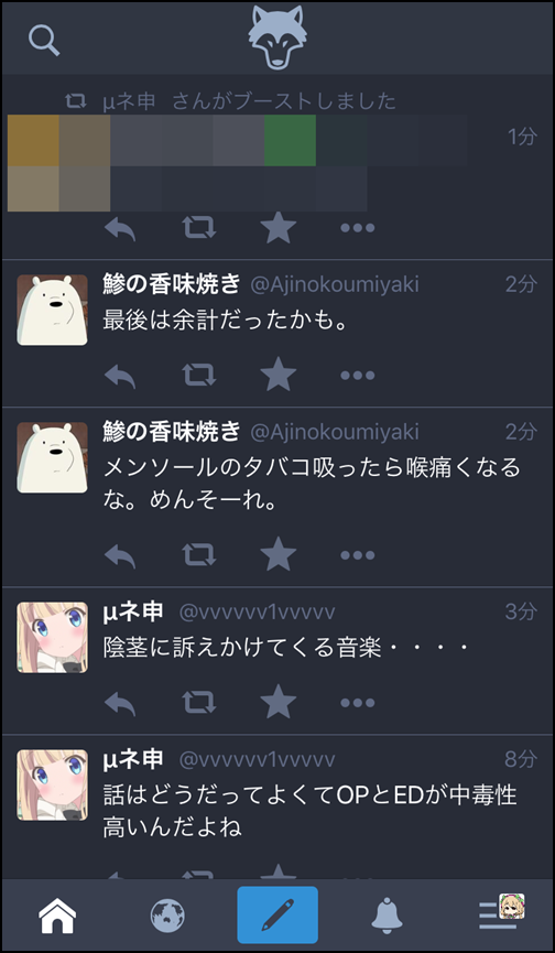 それで、画面下部にある『丸いアイコン』をタップすると連合タイムラインを開くことが出来るんだけど、パッと見だとローカルタイムラインなくなったんじゃない?って思ってしまうよね。