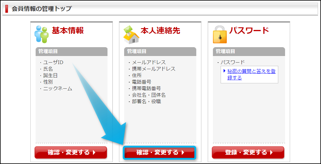 会員情報の管理トップの画面に移動したら『確認・変更する▶』をクリックしよう。