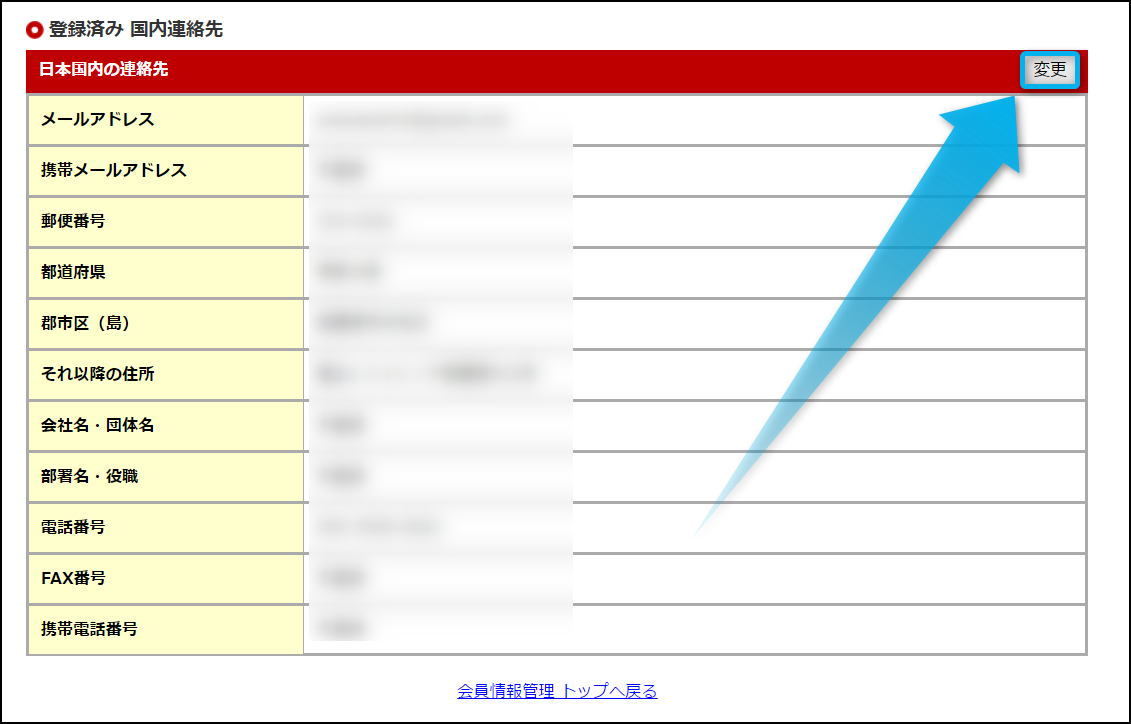 続いて、登録済み 国内連絡先の項目から『変更』をクリックして欲しい。